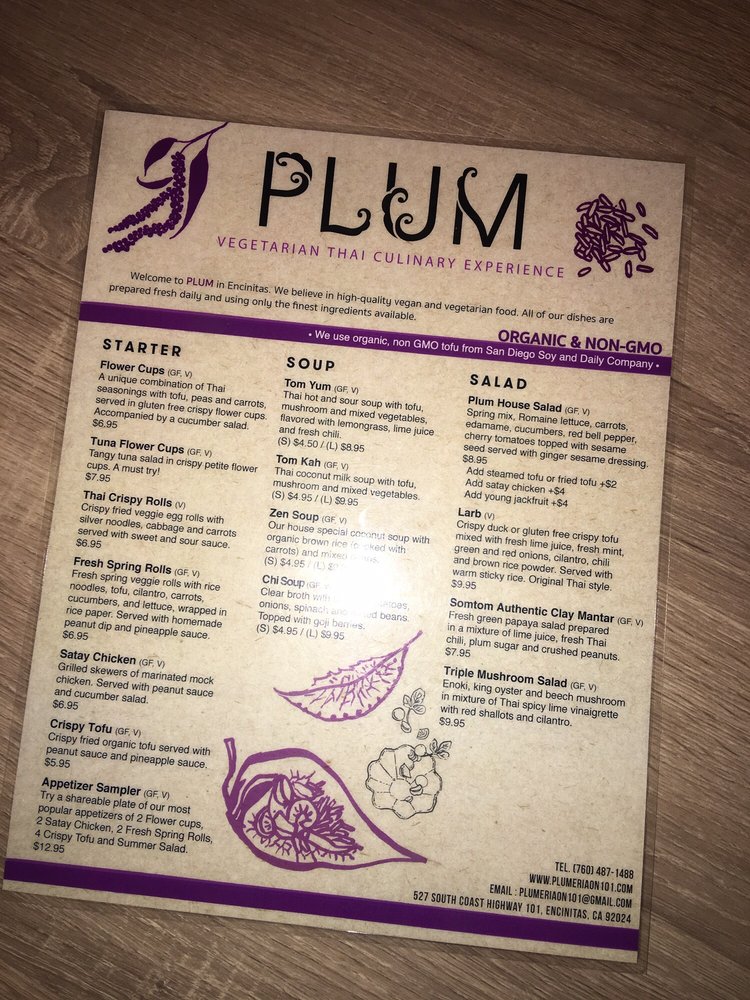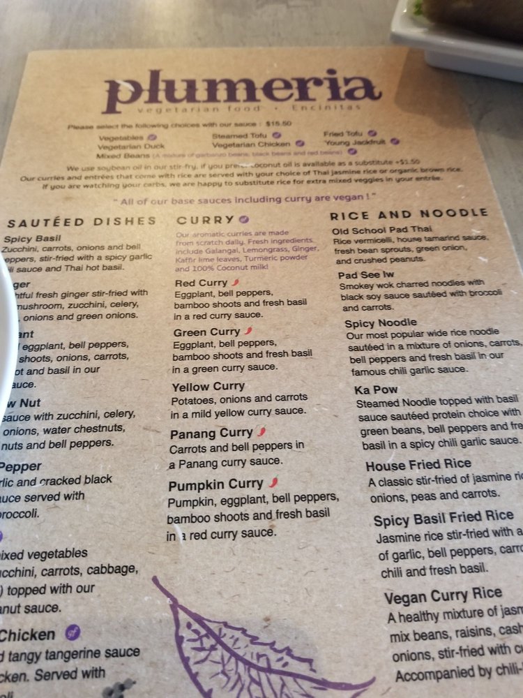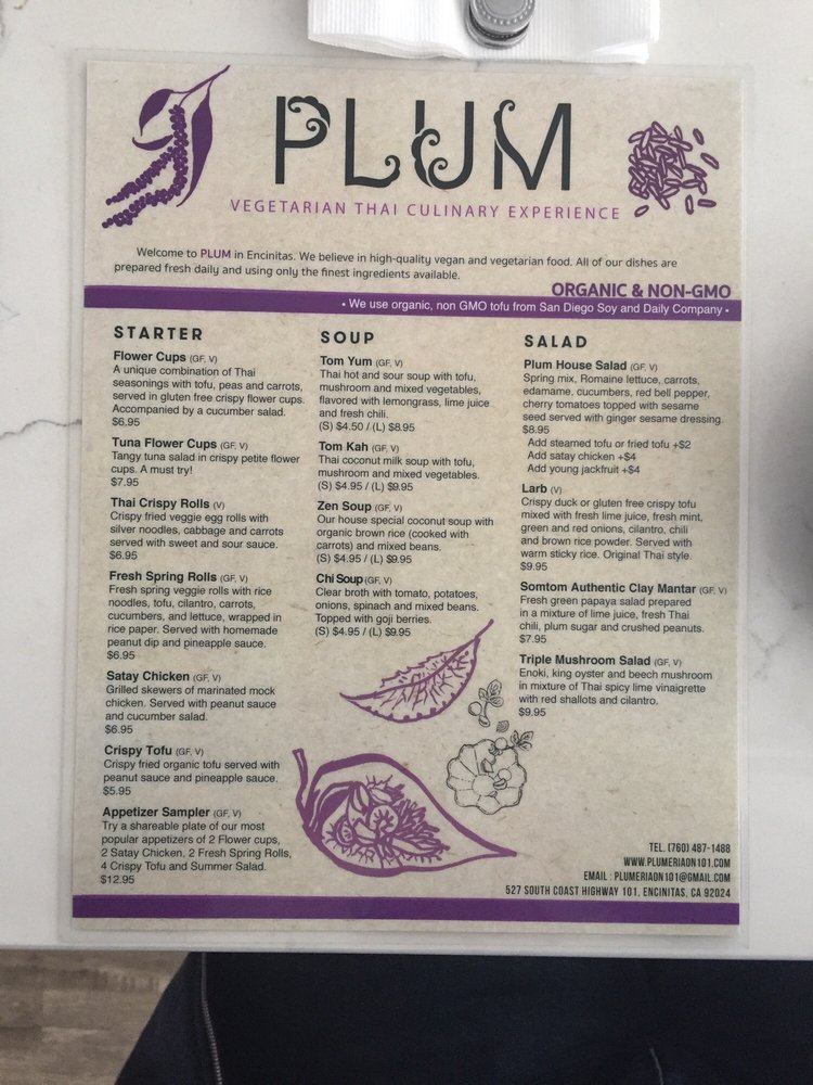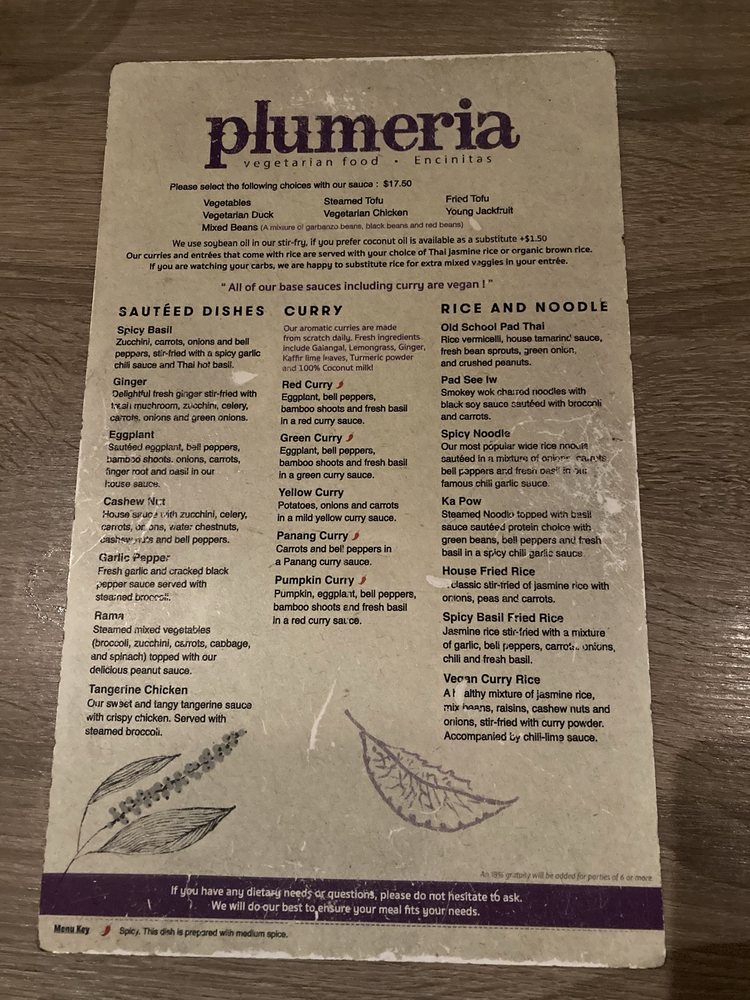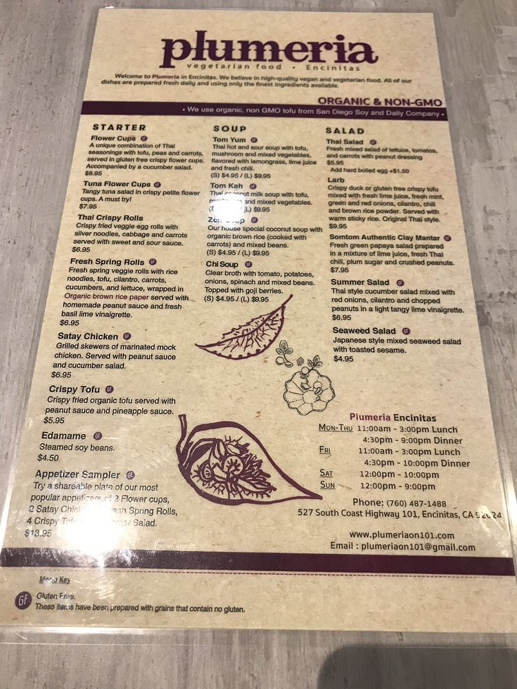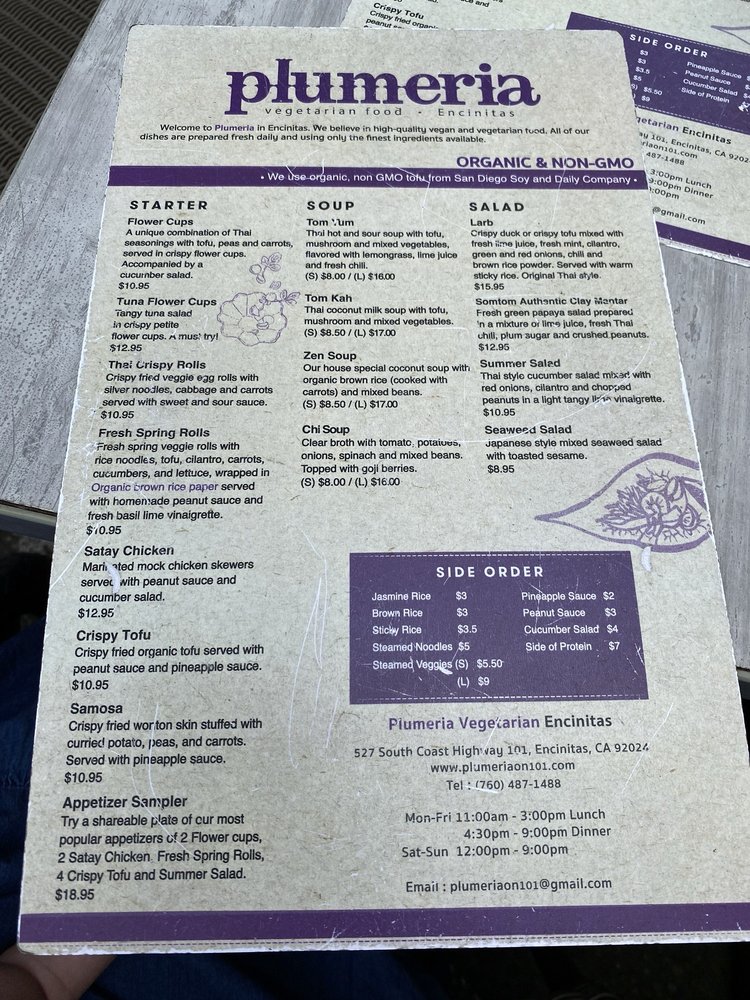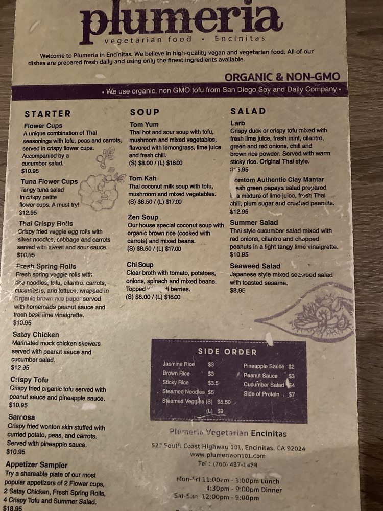 Plumeria Vegetarian Encinitas offers a delightful Thai dining experience with a range of vegetarian options. The menu includes starters like the Appetizer Sampler and Crispy Tofu, along with refreshing drinks such as Black Iced Tea and Mango Iced Tea. The Tea Galleries feature unique blends like Jasmine Blossom Tea and Spicy Ginger Tea. Located in Encinitas, CA, this restaurant is perfect for a casual dining experience with options for takeout, delivery, and catering. With a variety of vegan and pescatarian options, Plumeria Vegetarian Encinitas caters to a wide range of dietary preferences. Don't miss out on the chance to savor the flavors at this women-owned establishment, where you can enjoy a relaxing atmosphere with gender-neutral restrooms and Wi-Fi access. Visit Plumeria Vegetarian Encinitas for a memorable dining experience that celebrates Thai cuisine in a vegetarian-friendly setting.
